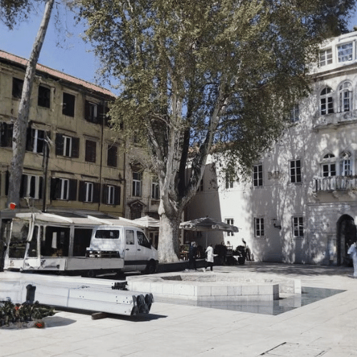 Pięć identycznych, ozdobnych studni – z żelaznymi pokrywami i kamiennymi obramowaniami.Wieża Kapetanova kula – średniowieczna wieża obronna, która dziś czasami pełni funkcje wystawowe.Park Królowej Jeleny Madijevki – najstarszy park miejski w Chorwacji, założony w XIX wieku przez austriackiego barona Franza Ludwiga von Weldena.Dziś…Plac pełni funkcję przestrzeni rekreacyjnej i kulturalnej – odbywają się tu koncerty, wystawy i różne wydarzenia plenerowe. To także idealne miejsce na spacer, zwłaszcza wieczorem, kiedy wszystko jest pięknie oświetlone, a z pobliskiego murku można podziwiać widok na nowoczesny port.